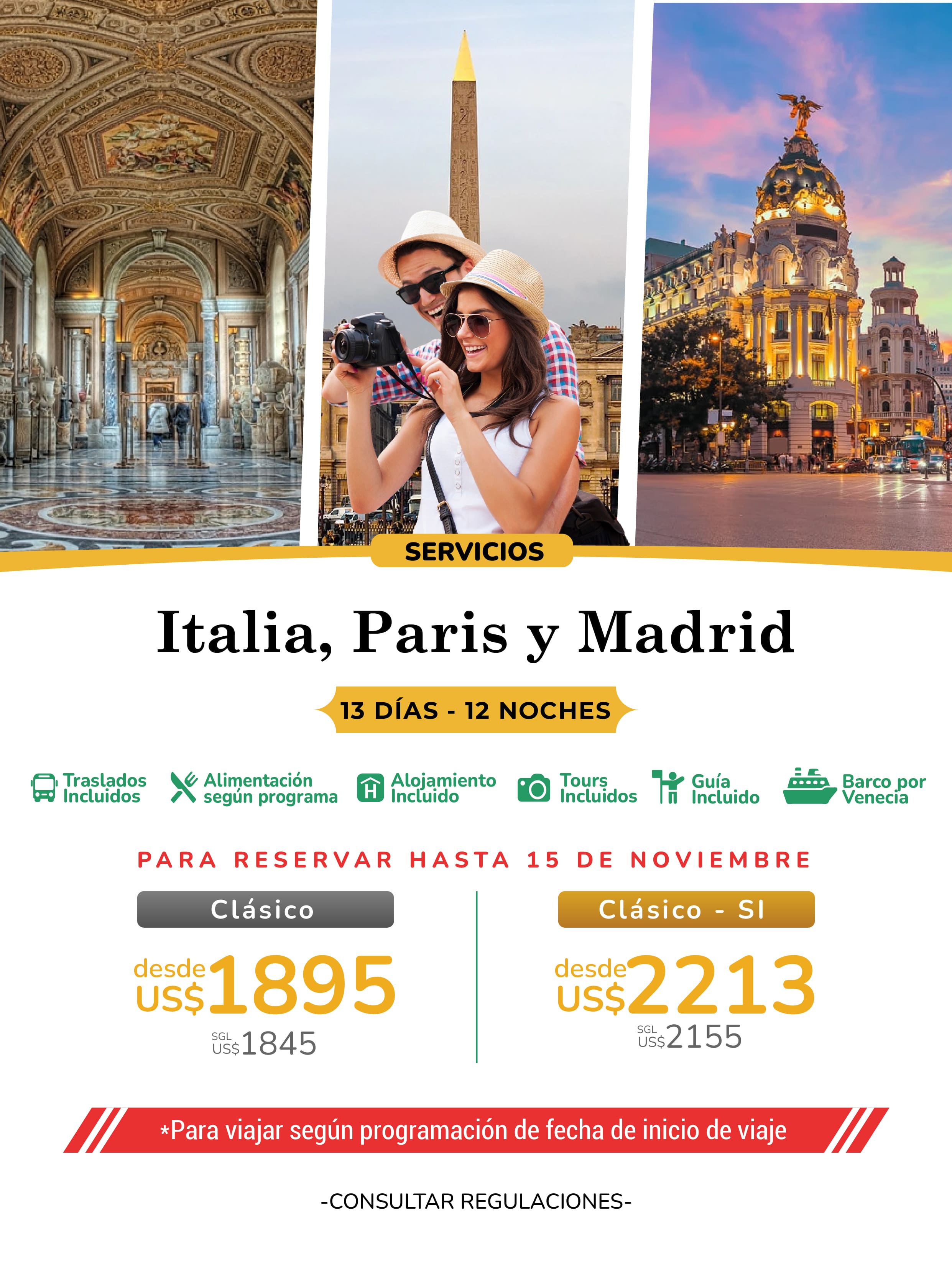 ,• Visitas panorámicas de Roma, Florencia, París y Madrid con guía local.