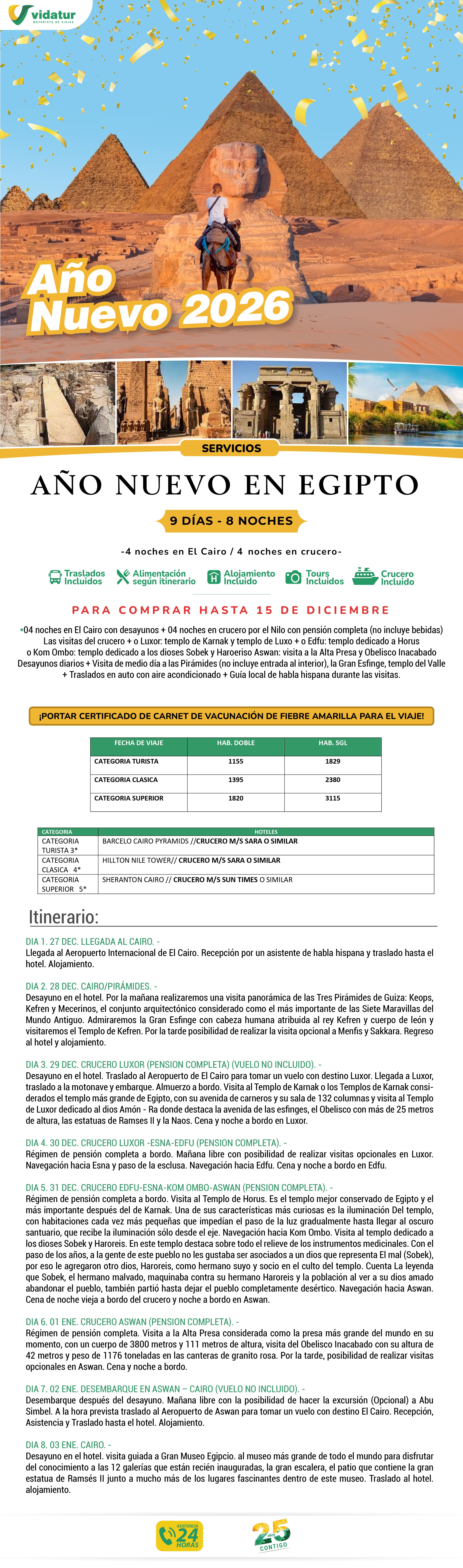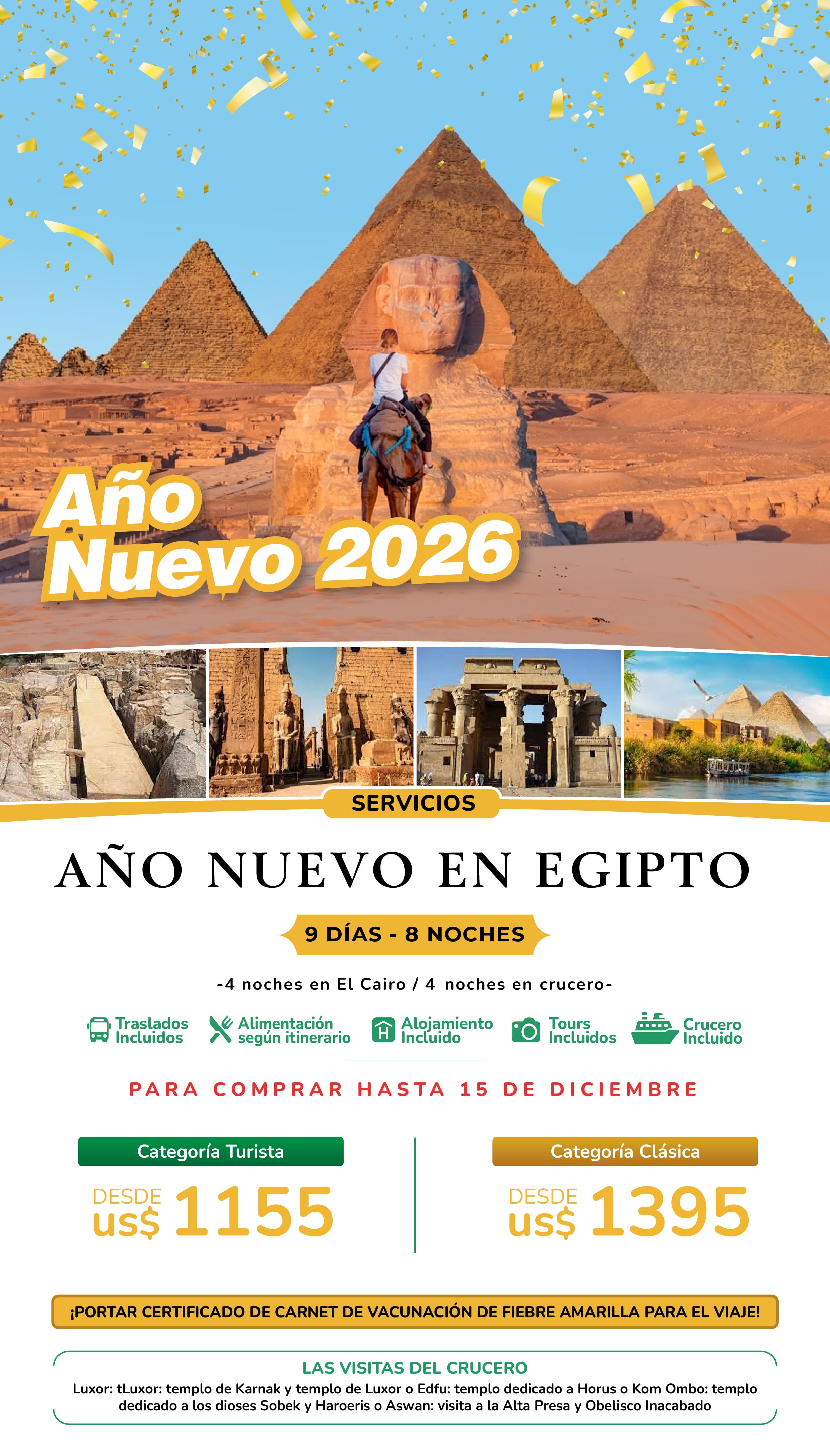 o Luxor: templo de Karnak y templo de Luxor o Edfu: templo dedicado a Horus o Kom Ombo: templo dedicado a los dioses Sobek y Haroeris o Aswan: visita a la Alta Presa y Obelisco Inacabado