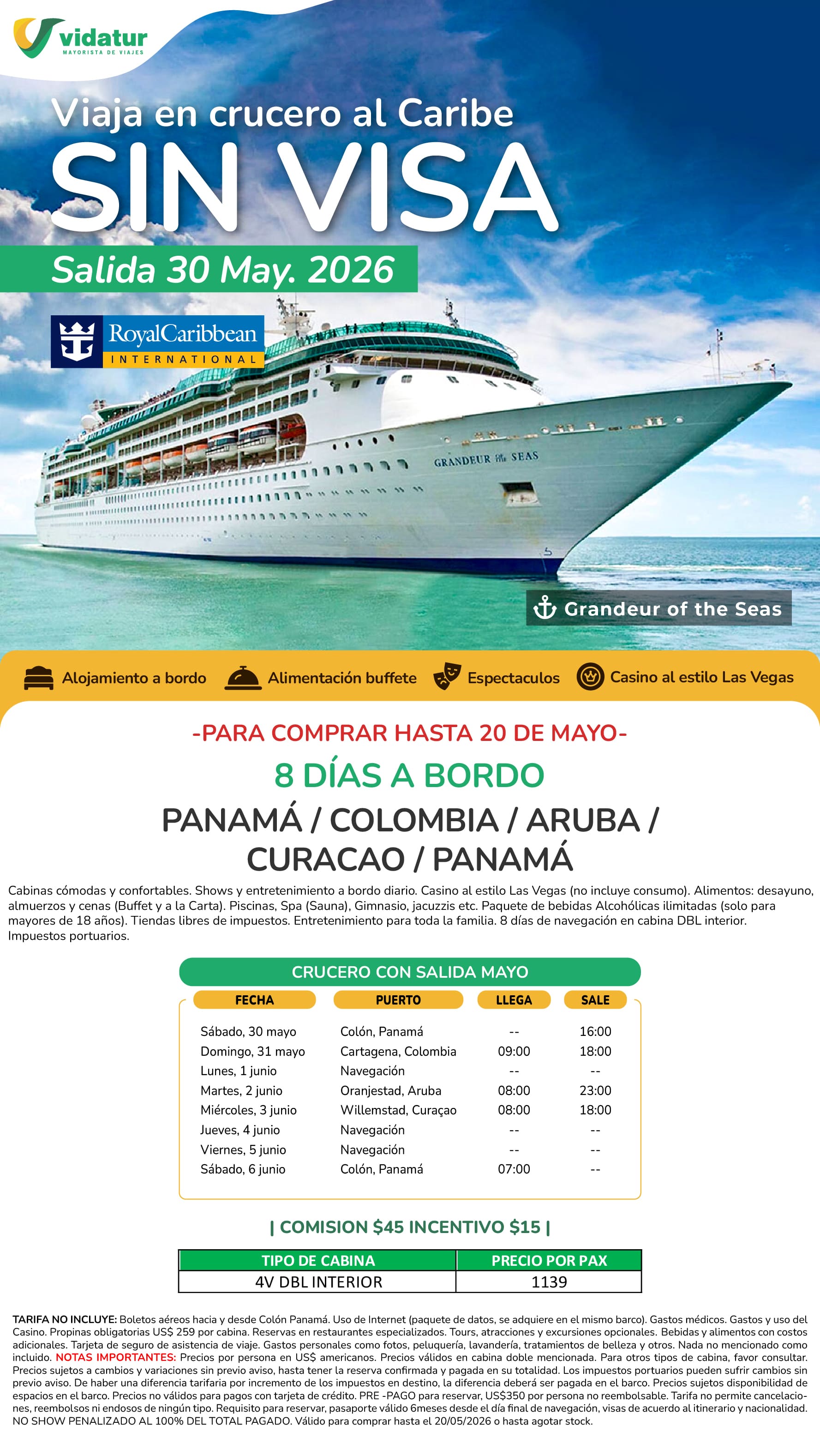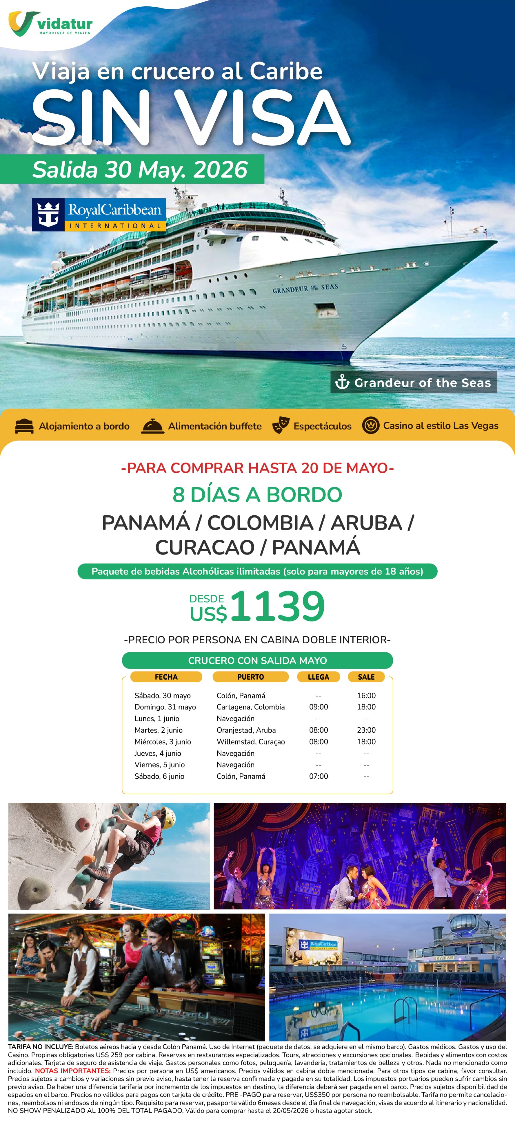 PROMO CRUCERO ROYAL CARIBBEAN SIN VISA SALIDA (PANAMA/COLOMBIA/ARUBA/CURACAO/PANAMA)