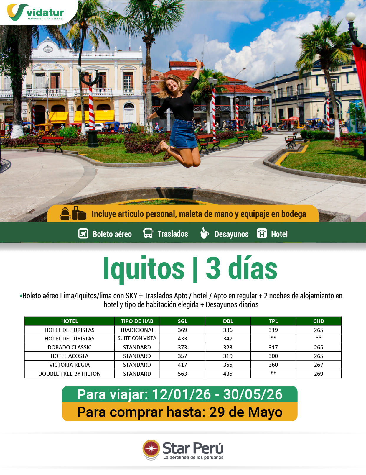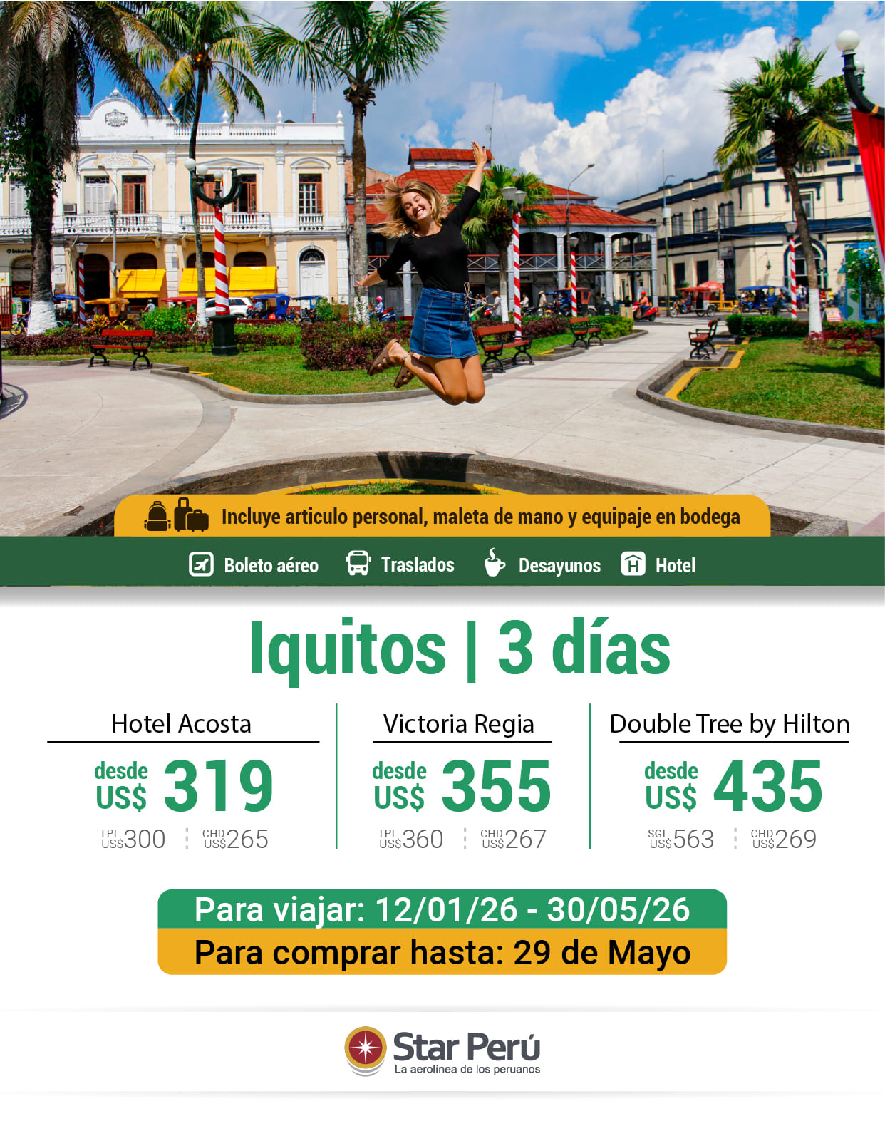 • Boleto aéreo Lima/Iquitos/lima con Star Perú (incluye equipaje de bodega)